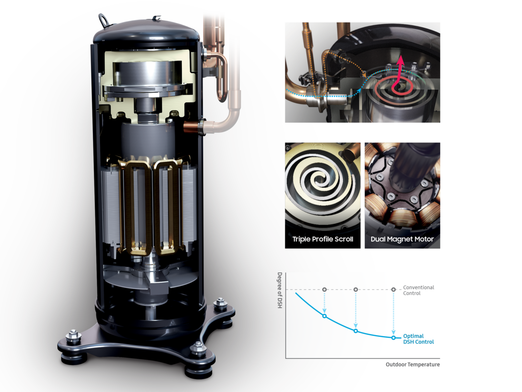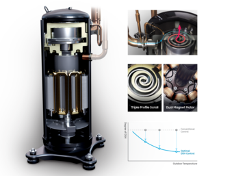 Der Triple Profile Scroll erzeugt eine deutlich größere Verdichtungskammer und hält höherem Druck stand. In Kombination mit dem Dual Magnet Motor, der die Drehleistung erhöht, entsteht das weltweit größte Verdrängungsvolumen seiner Klasse.