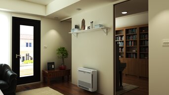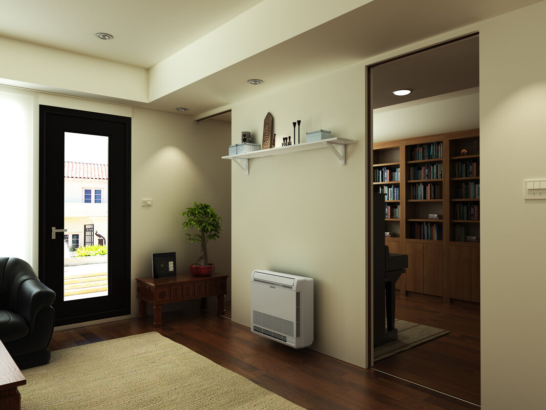 Truhengeräte sind die ideale Lösung, wenn Wand- oder Deckenmontage nicht möglich ist – z. B. bei Dachschrägen, Wintergärten oder niedrigen Fensterbrüstungen. Sie werden bodennah montiert, arbeiten effizient und lassen sich über Fernbedienung oder App steuern. Der Luftstrom kann wahlweise nach oben oder unten ausgerichtet werden.