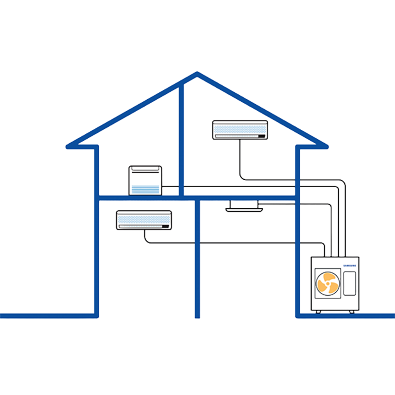 Das Außengerät erzeugt die Kälteleistung und verteilt sie über Leitungen an alle Innengeräte. Dank Invertersteuerung passt sich die Leistung automatisch an den tatsächlichen Bedarf an. Dadurch arbeitet das System ohne Temperaturspitzen leise, energieeffizient und gleichmäßig.Jedes Gerät kann separat über Fernbedienung oder SmartThings App gesteuert werden.