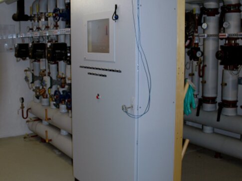 Einzelraumregelung der Büros über DDC mit DEOS COSMOweb, gleichzeitiger Zugriff über mehrere PCs und Tablet-PCs, 2 Schaltschränke, 232 Datenpunkte, 13 Heizkreise, DEOS-Controller DS4100 Open