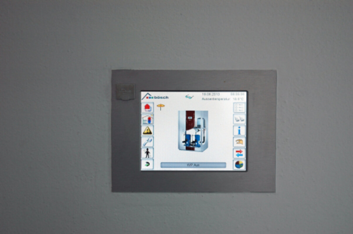 Gesteuert wird die Wärmepumpe über ein Touch- Bedienfeld, welches mittels eines Wandmontagesets als drahtgebundene Fernbedienung eingesetzt wird. Somit kann Familie Kroisl alle relevanten Betriebszustände und Funktionen überwachen und vom Touch- Bedienfeld im Wohnzimmer aus steuern.