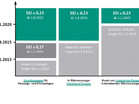 3. In einem letzten Umsetzungsschritt gelten die Vorgaben ab 2020 auch für den Austausch integrierter Pumpen in bestehenden Wärmeerzeugern. Von den Vorgaben betroffen sind alle Nassläufer-Umwälzpumpen im Heizungs- und Klimabereich.
