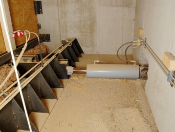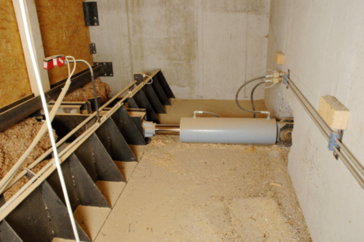 Gelagert wird das Hackgut in der ebenfalls neu errichteten offenen Lagerhalle. Diese hat ein Fassungsvermögen von 1.500 Srm. Über hydraulische Schubstangen wird das Hackgut in eine Förderschnecke geschoben. Diese transportiert den Brennstoff dann über einen Fallschacht – welcher je Kessel mit einer Rückbrandklappe versehen ist – zur Stokerschnecke.