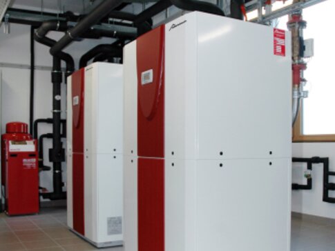 Die Entscheidung fiel auf eine Sole-/Wasser-Wärmepumpe von bösch. Mit insgesamt 54 kW Nennwärmeleistung, bereitgestellt von zwei Sole-/Wasser-Wärmepum pen des Typs Calida SI 24 TE und SI 30 TE wird die Grundwärmelast spie-lend abgedeckt. Neun Sole sonden in einer Tiefe von je 127 Meter sorgen für die perfekte Wärme- und Kühlquelle. Dank der Konzipierung mit Passiv-Kühlsystem kann das Gebäude im Sommer über die Tiefensonden mittels Beton kernaktivierung gekühlt werden. Der gesamte Kühlbedarf beider Anlagen beträgt 42,5 kW