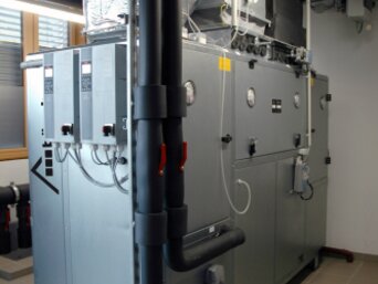 Dank einem bösch Zu-/Abluftgerät mit integriertem Kreuzstrom-Wärme-/Kälterückgewinnungssystem herrscht jederzeit perfekt konditionierte Raumluft. Die Zuluft wird mittels der Restwärme respektive Restkälte der Abluft vorgewärmt bzw. vorgekühlt. Insgesamt werden zirka 4.500 m³ Luft pro Stunde umgewälzt. Die Lüftungsanlage befindet sich zusammen mit der kompletten Heizungs- und Regelungstechnik im Technikraum.