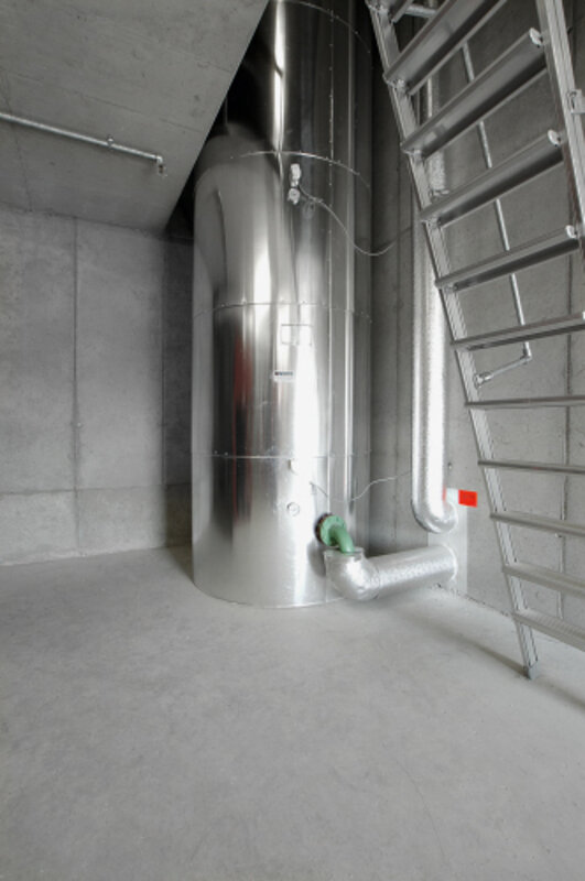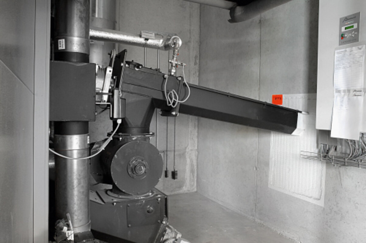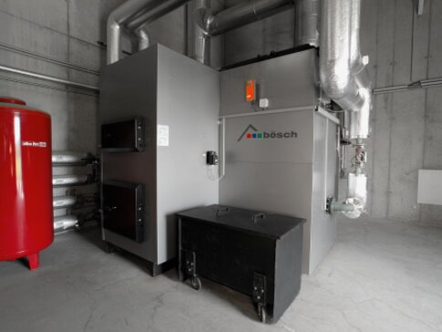 Die Heizung selbst wird umweltfreundlich mit erneuerbarer Energie betrieben (derzeit Pellets, wahlweise auch Hackschnitzel möglich). Dafür ist eine modulierende Pellets- und Hackgut-Heizzentrale mit 500 kW Heizleistung im Einsatz. Der bösch Pyrogrande PMT sorgt mit seiner ausgefeilten Technik für optimale Verbrennungswerte. Der bewegbare Vorschubrost verbrennt selbst schwierige Brennstoffe effizient und vollständig. Die unter dem Rost anfallende Asche wird mittels Rechen automatisch zum fahrbaren Aschecontainer transportiert. Bei allem Hightech ist der Kessel extrem servicefreundlich. Die Pellets werden über eine 6 m lange Pellets-Förderschnecke eingebracht. Der Pellets-Lagerraum hat ein Fassungsvermögen von insgesamt 75 m³.