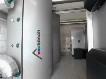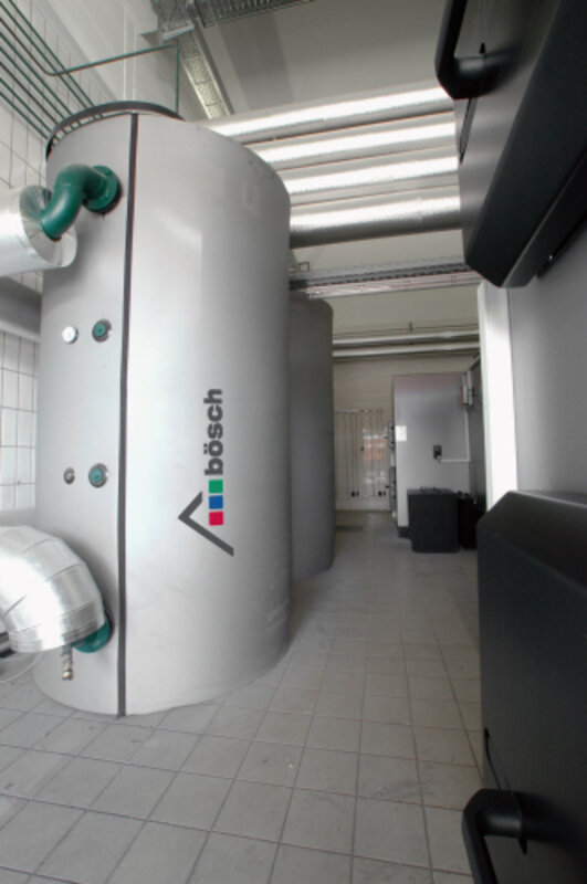 Ein Teil der Wärme wird auch zur Erzeugung des Warmwassers für die Mitarbeiterduschen benötigt. Überschüssige Energie wird in den zwei Pufferspeichern mit einem Fassungsvermögen von je 3.000 Litern zwischen-gespeichert.