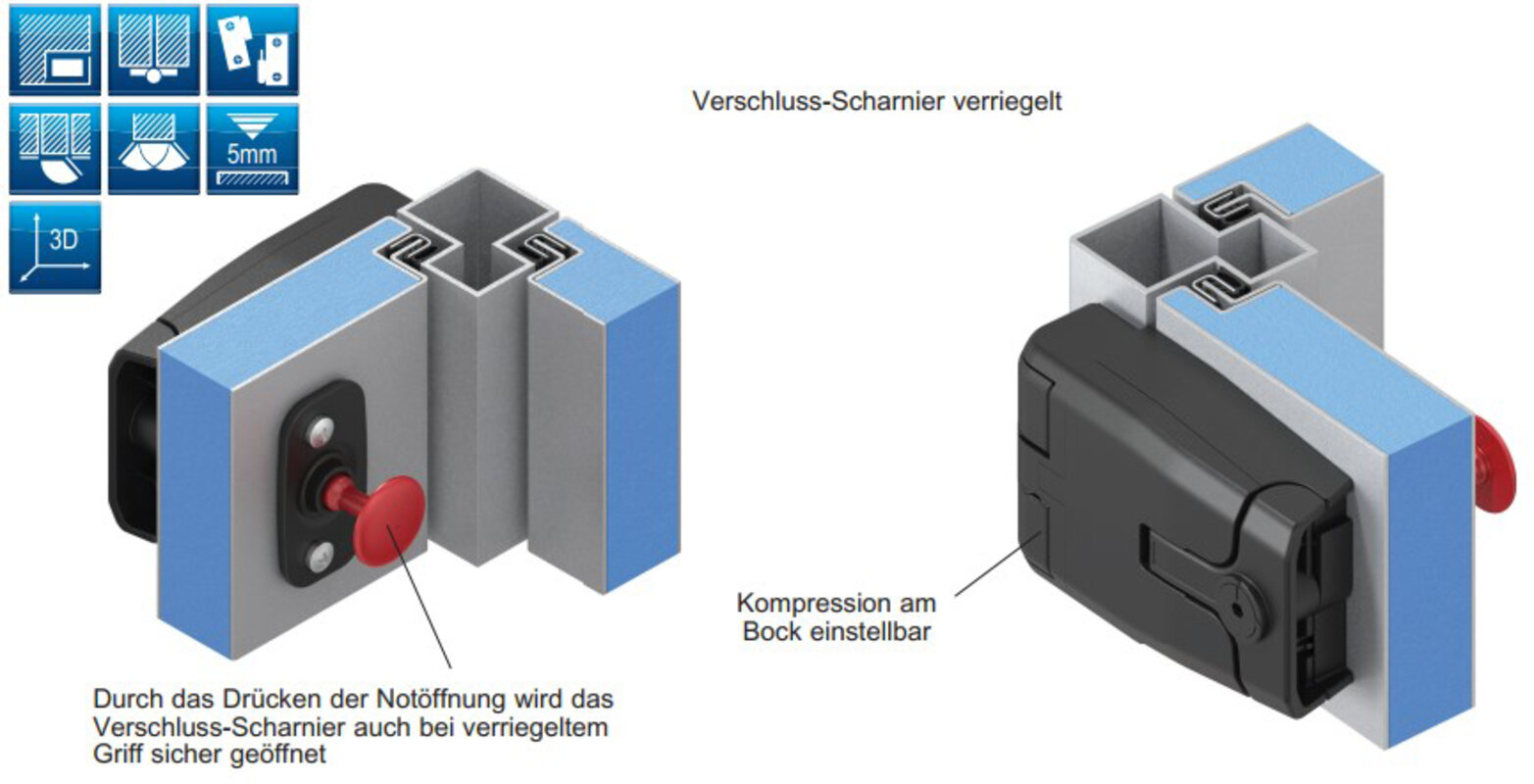 - Optional: Verschluss-Scharnier mit Sicherheitsfunktion Druckentlastung