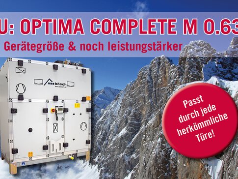 Unser Standard-RLT Gerät optima complete ist ab sofort in einer neuen Gerätegröße verfügbar. Dank seiner um 15 cm schlankeren Bauform, passt das Gerät jetzt durch jede herkömmliche Türe. Als zusätzlichen Benefit bringt die neue Gerätegröße M 0.63 eine verbesserte Performance bei unverändert herausragender Energieeffizienz (A+) mit sich.