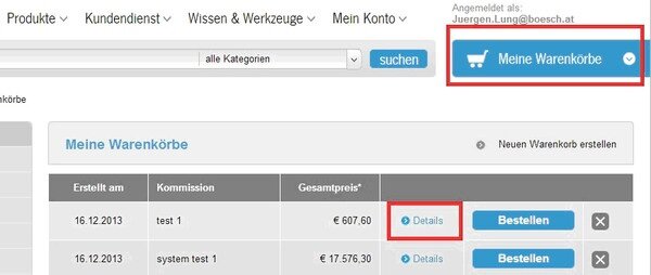 Wählen Sie den gewünschten Warenkorb aus und klicken Sie auf „Details“.