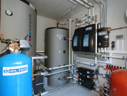 Aus energetischer Sicht erfüllt das Gebäude die höchsten Umweltstandards. So wurde bewusst auf den Einsatz erneuerbarer Energieträ-ger – Solar und Wärmepumpe – geachtet. Am Dach sind 20 m² Solarkollektoren von bösch installiert. Die Wärmeenergie wird in den beiden Pufferspeichern mit insgesamt 3.000 l Fassungsvermögen zwischengespeichert. Über zwei Frischwasserstationen wird das Warmwasser im Durchlaufprinzip immer frisch erwärmt. So ist jederzeit hygienisch einwandfreies Wasser in ausreichender Menge vorhanden.