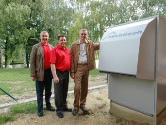 Zur Abdeckung von Lastspitzen dient die hinter dem Gebäude aufgestellte bösch Mitteltemperatur Luft-/Wasser-Wärmpumpe. Durch die höhere Vorlauftemperatur von 65° C ist sie ganzjährig für die Warmwasserbereitung einsetzbar.