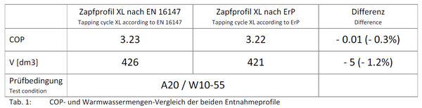 Da die unterschiedlichen Klassen vor allem abhängig von der Leistungszahl des Produktes sind, wird zuerst auf diese Zahl eingegangen. In der Tab. 1 sind die Leistungszahlen von einem handelsüblichen Wärmepumpenboiler ersichtlich, die nach der EN 16147 und ERP-Richtlinie ermittelt wurden. Die beiden Zapfprofile sind, bis auf einige Durchflussraten von Wasserentnahmen, identisch.