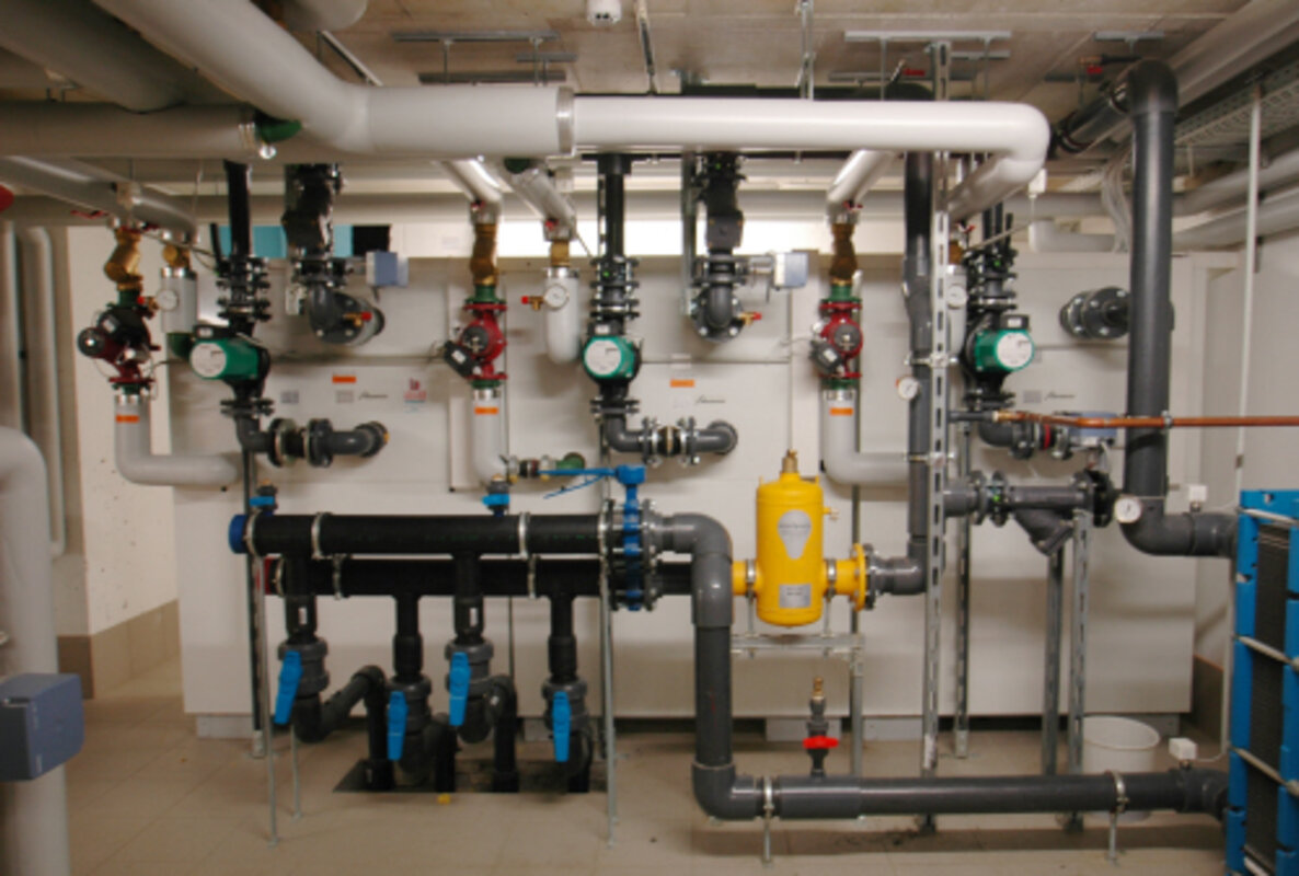 Gesamt wurden drei Sole-/Wasser-Wärmepumpen mit jeweils 75 kW Nennwärmeleistung eingebaut. So wird die benötigte Grundwärmelast leicht abgedeckt. Für den Entzug der Wärme hat man sich für 19 Solesonden entschieden. Diese wurden unterhalb des Hotels eingebracht, 18 davon reichen bis zu 200 Meter tief in das Erdreich.
